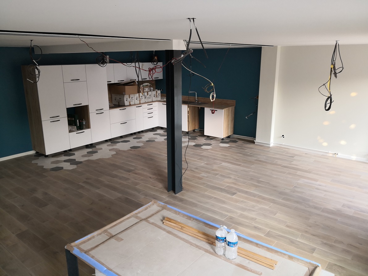 Monsieur Eloy a fait le choix du Parquet Lames Larges EASIKLP – Pierre de Lune pour le salon de sa maison. Un harmonieux mélange avec le noir du poteau central et les coloris plus clairs de la cuisine. Le carrelage délimite la partie cuisine , un joint de finition est mis en place entre le carrelage et le parquet afin d’éviter les sur épaisseurs.